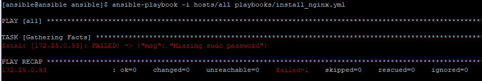 Ansible playbook으로 배포하려는 대상서버에서 접근계정을 sudoers에 추가해주면 문제가 해결됨
